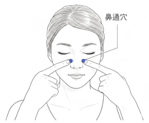 - 鼻通穴(上迎香):位於鼻翼軟骨與鼻甲的交界處,當鼻唇溝上端盡頭。專治鼻塞不通,具有清熱散風、宣通鼻竅的作用。